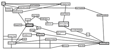 The above chart centers on two key sets of relationships. The first is Blake’s association to Cownie because of his courtship of Anna Gaskell. The second is the connection between Duncan, L.A. Weekly reporter Kate Coe, and Coe’s employer, MediaBistro.com.** One of the things one immediately notes in this chart is the redundant ties between players, and the persistent links to the Central Intelligence Agency.